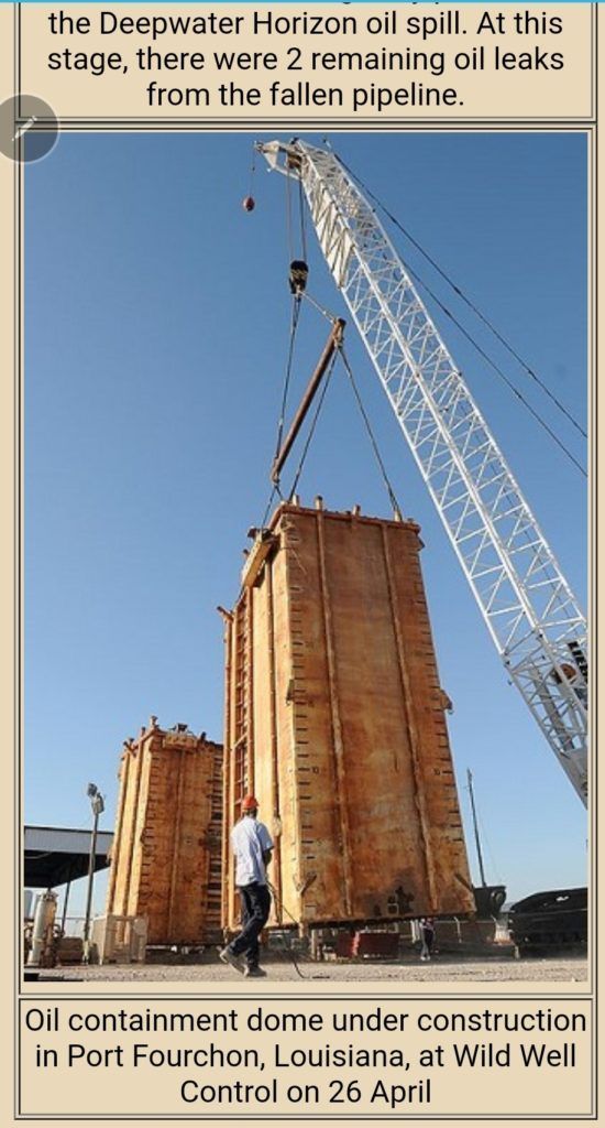 In October 2012, BP reported that they had found and plugged leaking oil from the failed containment dome, now abandoned about 1,500 feet (460 m) from the main well. In December 2012, the USCG conducted a subsea survey; no oil coming from the wells or the wreckage was found and its source remains unknown. In addition, a white, milky substance was observed seeping from the wreckage. According to BP and the USCG, it is “not oil and it’s not harmful.”